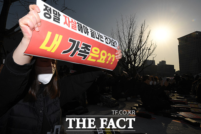 [더팩트ㅣ남용희 기자] 거리두기 지침 강화에 반발하는 코로나19 대응 전국자영업자비상대책위원회가 22일 오후 서울 종로구 광화문시민열린마당에서 총궐기를 진행한 가운데 한 참가자가 피켓을 들어 보이며 구호를 외치고 있다.