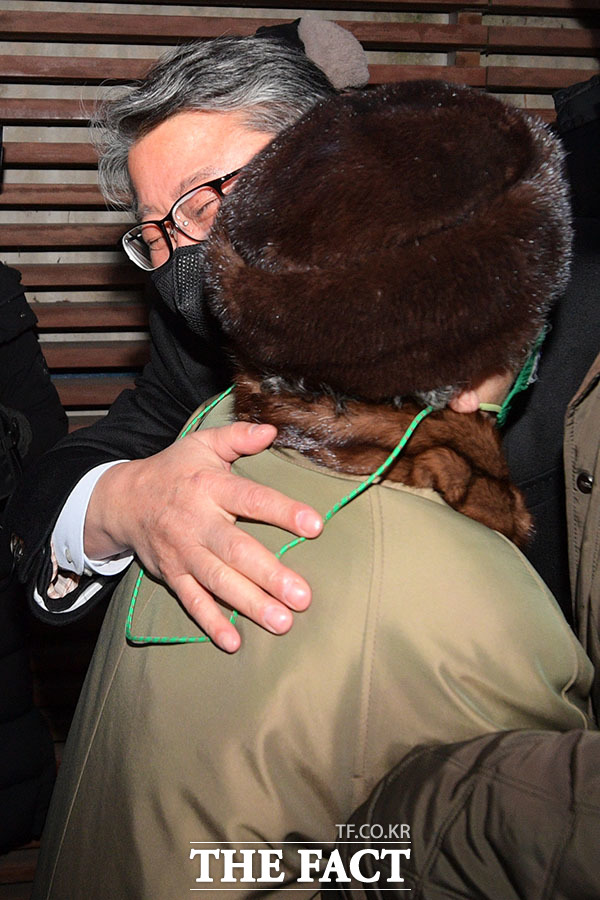 [더팩트ㅣ남윤호 기자] 박근혜 전 대통령의 특별사면, 복권이 발표된 24일 오후 박 전 대통령이 입원 치료 중인 서울 강남구 삼성서울병원 앞에서 조원진 우리공화당 대선 후보가 참가자와 포옹하며 기쁨을 나누고 있다.