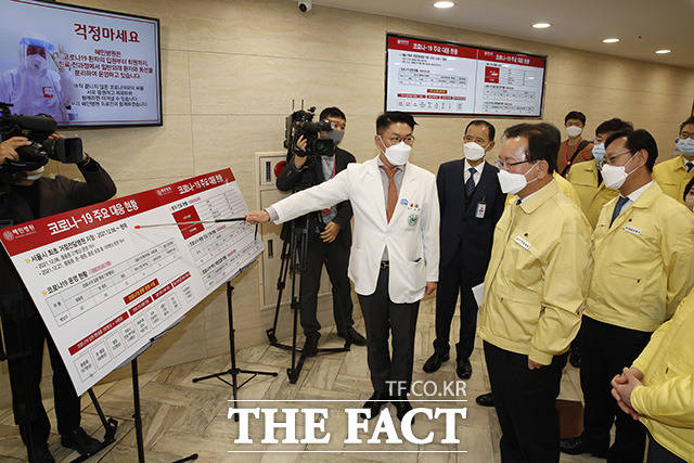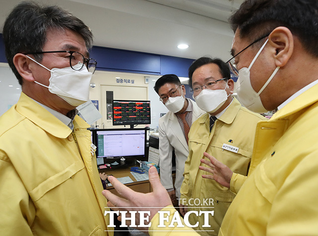 김부겸 국무총리가 6일 오전 코로나19 의료대응 현장 점검차 서울 광진구 혜민병원을 찾아 준중증·중등증 병상에서 현황보고를 받고 있다./임영무 기자