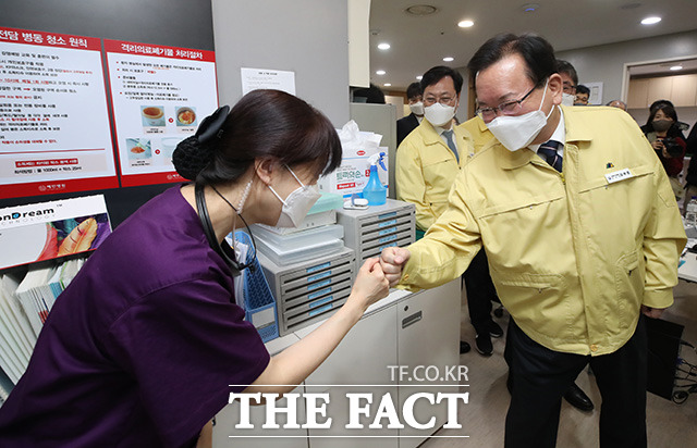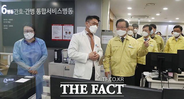 [더팩트ㅣ임영무 기자] 김부겸 국무총리가 6일 오전 코로나19 의료대응 현장 점검차 서울 광진구 혜민병원을 찾아 준중증·중등증 병상을 둘러본 뒤 의료진을 격려하고 있다.