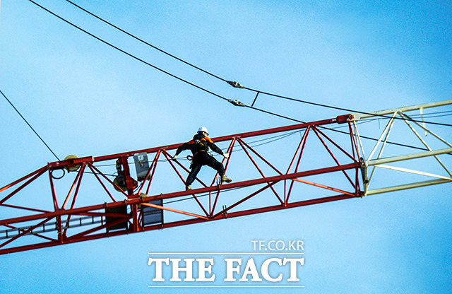 [더팩트ㅣ광주=이동률 기자] 21일 오전 광주광역시 서구 화정동 HDC현대산업개발 아이파크 아파트 신축공사 붕괴사고 현장에서 공사 관계자들이 타워크레인 철거를 위해 고공 작업을 하고 있다.