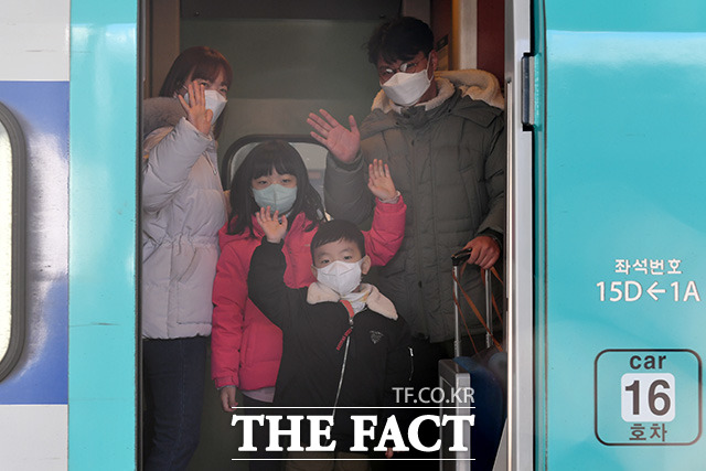 [더팩트ㅣ남용희 기자] 설 연휴를 하루 앞둔 28일 오전 서울 중구 서울역에서 한 가족이 고향으로 가는 열차에 올라 손을 흔들고 있다.