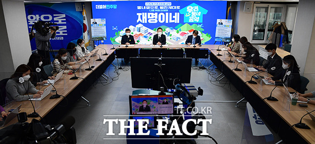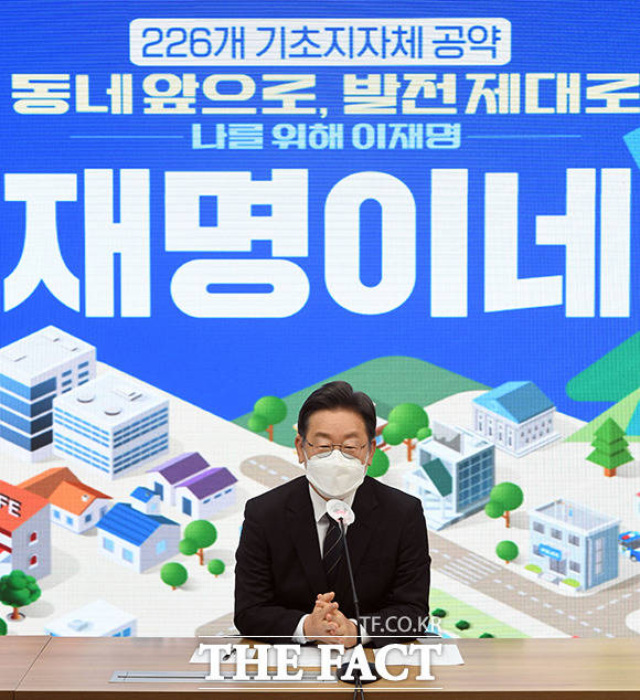[더팩트|이선화 기자] 이재명 더불어민주당 대선 후보가 4일 오후 서울 여의도 더불어민주당 중앙 당사에서 '우리동네공약' 언박싱데이를 열고 발언하고 있다.