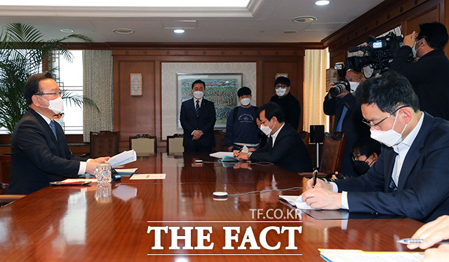 [더팩트ㅣ임영무 기자] 김부겸 국무총리(왼쪽)가 24일 오후 서울 종로구 서울정부청사 총리 집무실에서 오미크론 대응 관련 전문가 간담회를 하고 있다.