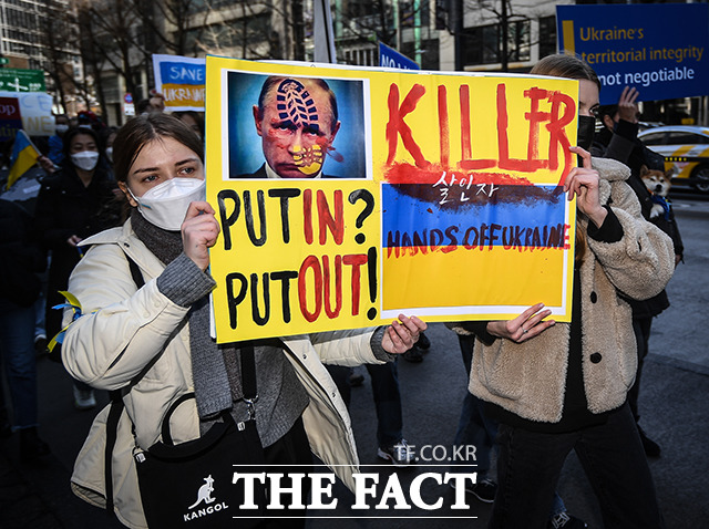 국내에 체류 중인 우크라이나인들은 이날 러시아 대사관 앞에서 열린 집회에서 러시아의 우크라이나 침공을 규탄했다.