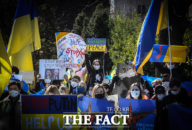 국내에 체류 중인 우크라이나인들은 이날 러시아 대사관 앞에서 열린 집회에서 러시아의 우크라이나 침공을 규탄했다.