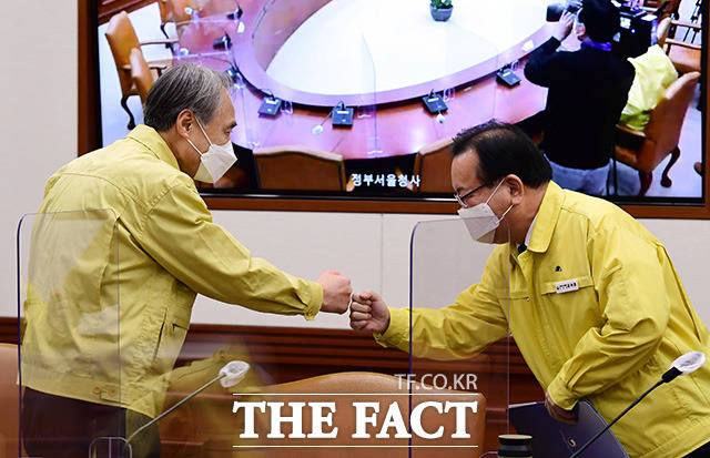 [더팩트ㅣ임영무 기자] 김부겸 국무총리(오른쪽)가 2일 오전 서울 종로구 정부서울청사에서 열린 코로나19 중앙재난안전대책본부(중대본) 회의에 참석해 오명돈 국가감염병임상위원장과 인사를 하고 있다.darkroom@tf.co.kr사진영상기획부 photo@tf.co.kr