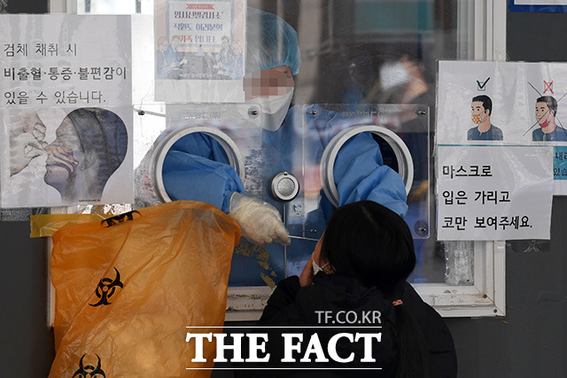 [더팩트ㅣ남용희 기자] 국내 코로나19 누적 확진자가 1000만 명을 넘어선 23일 오전 서울 중구 서울역 광장 임시선별검사소에서 한 어린이가 PCR검사를 받고 있다.