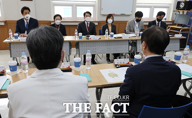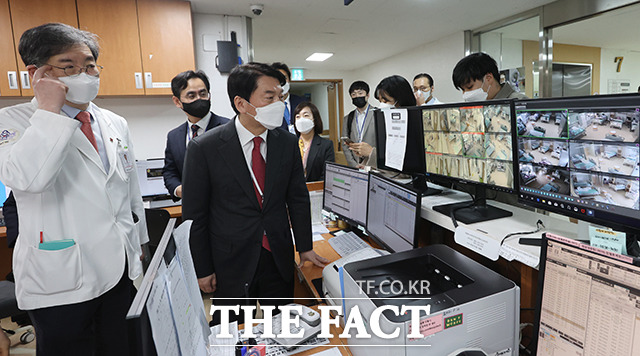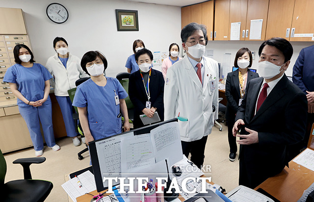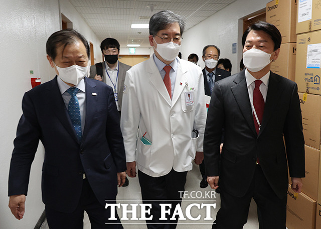 [더팩트ㅣ임영무 기자] 안철수 인수위원회 위원장(오른쪽)과 코로나비상대응특위 위원들이 31일 오후 서울 종로구 서울적십자병원 코로나19 외래진료센터를 방문해 문영수 서울적십자병원장과 의료진을 만나 현황에 대한 보고를 받고 있다.