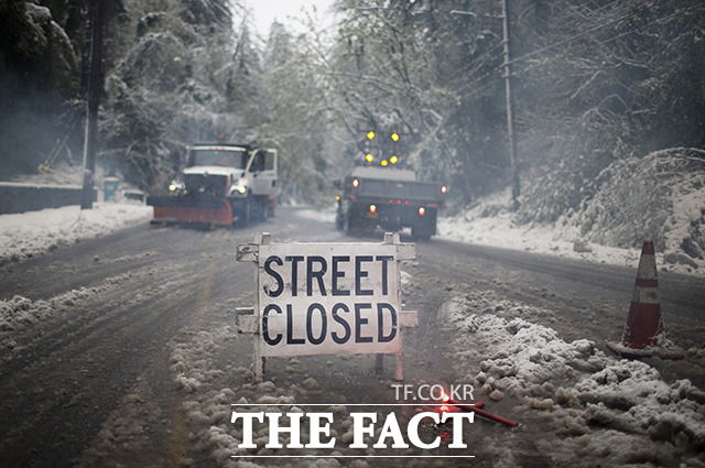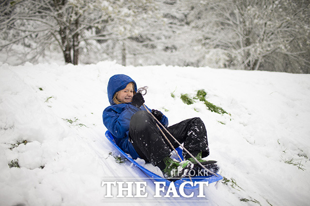 [더팩트ㅣ남용희 기자] 11일(현지시간) 미국 오리건주 포틀랜드 타보르 산에 눈이 내린 가운데 아이들이 눈썰매를 타고 있다.