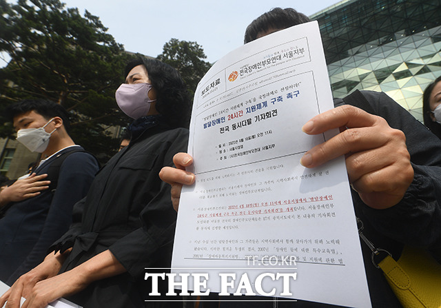 [더팩트ㅣ이동률 기자] 전국장애인부모연대 회원들이 18일 오전 서울 중구 서울시청 앞에서 기자회견을 갖고 '발달장애인 24시간 지원체계 구축'을 촉구하고 있다.