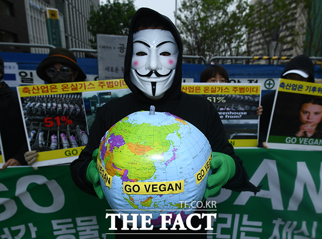 [더팩트ㅣ이동률 기자] 지구의날인 22일 오후 서울 종로구 광화문역 인근에서 한국채식연합 회원들이 지구의 날 맞이 비건 채식을 촉구하는 기자회견을 하고 있다.