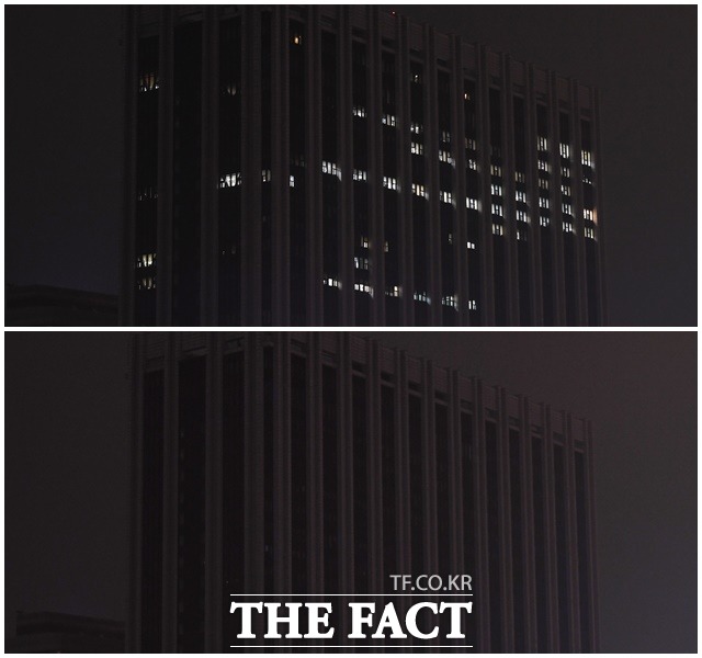 [더팩트ㅣ남용희 기자] '제52회 지구의 날'을 맞은 22일 오후 서울 종로구 서울정부청사에 소등행사가 진행되고 있다. 사진은 소등 전과 후 서울정부청사 모습.