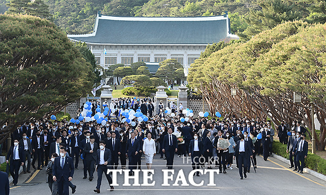 [더팩트ㅣ이새롬 기자] 문재인 대통령이 임기 마지막 날인 9일 오후 청와대에서 퇴근하며 청와대 앞에 모인 시민들을 향해 인사하고 있다.