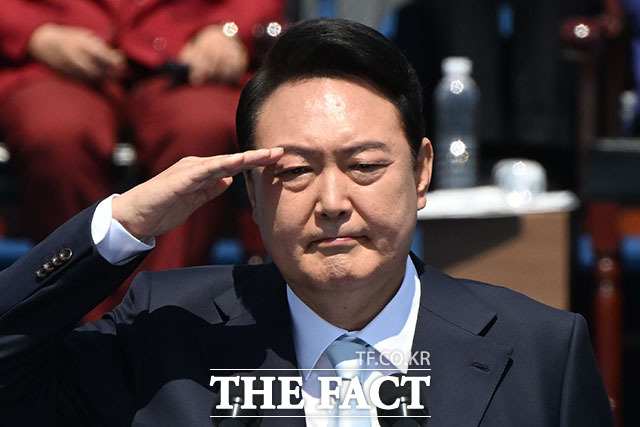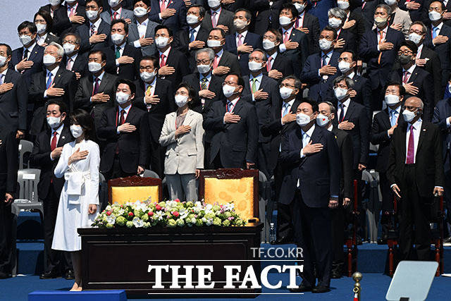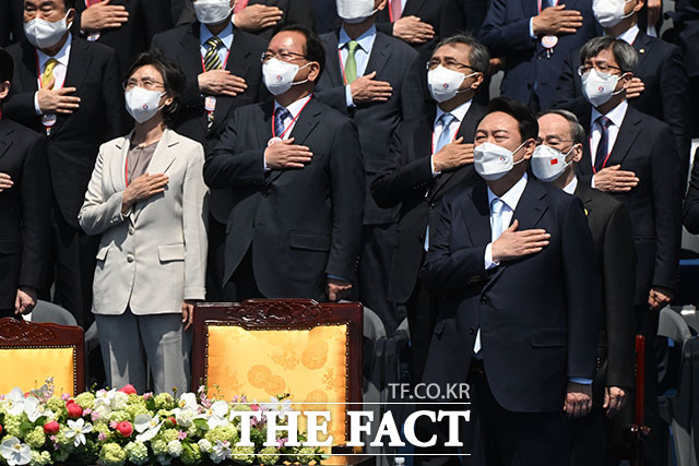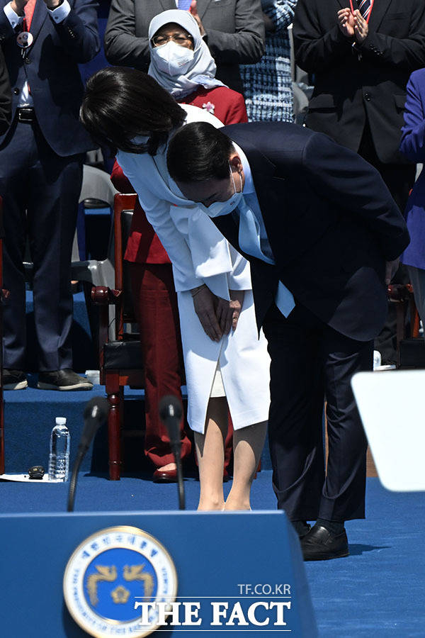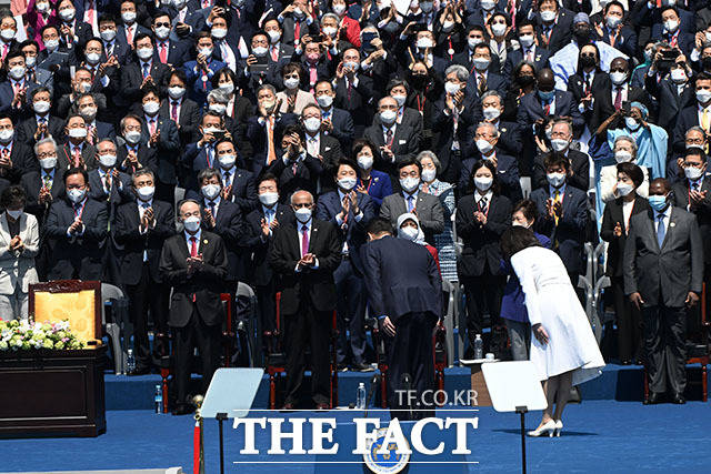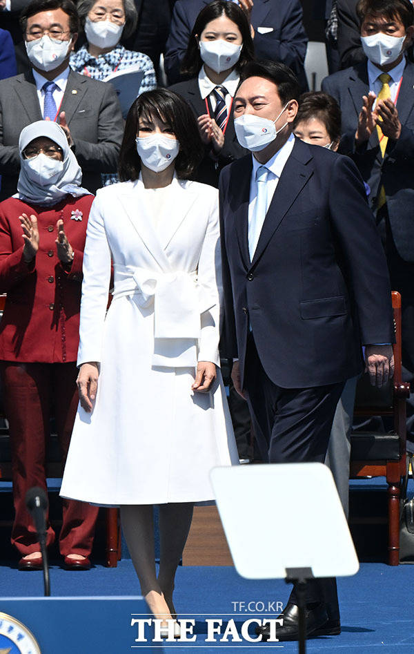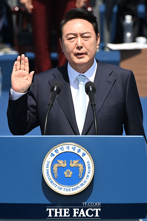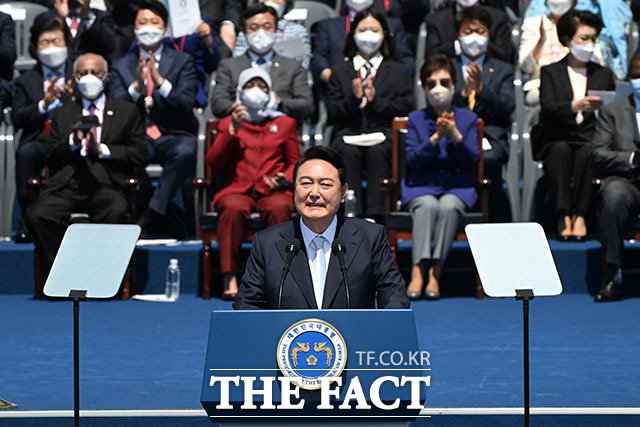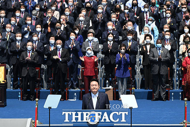 [더팩트ㅣ국회=남윤호 기자] 윤석열 제20대 대통령이 10일 오전 서울 여의도 국회에서 열린 취임식에서 선서와 취임사를 마친 후 국민을 향해 손을 흔들고 있다.