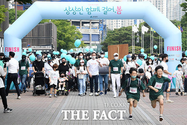 [더팩트ㅣ남용희 기자] '2022 상상인 피크닉 데이'가 21일 오전 서울 송파구 올림픽공원에서 열린 가운데 유준원 대표와 참가자들이 걷기 행사를 하고 있다.