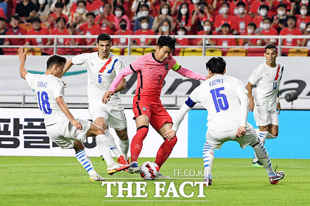 [더팩트ㅣ수원월드컵경기장=남용희 기자] 대한민국과 파라과이의 평가전이 10일 오후 경기도 수원시 팔달구 수원월드컵경기장에서 열린 가운데 손흥민(가운데)이 드리블을 시도하고 있다.
