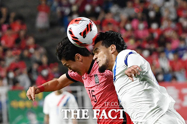 [더팩트ㅣ수원월드컵경기장=남용희 기자] 대한민국과 파라과이의 평가전이 10일 오후 경기도 수원시 팔달구 수원월드컵경기장에서 열린 가운데 황의조(왼쪽)가 볼다툼을 하고 있다.