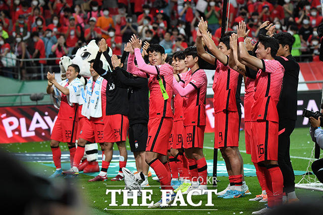 [더팩트ㅣ서울월드컵경기장=남용희 기자] 대한민국과 이집트의 평가전이 14일 오후 서울 마포구 서울월드컵경기장에서 열린 가운데 대표팀 선수들이 경기 후 팬들에게 인사를 하고 있다.