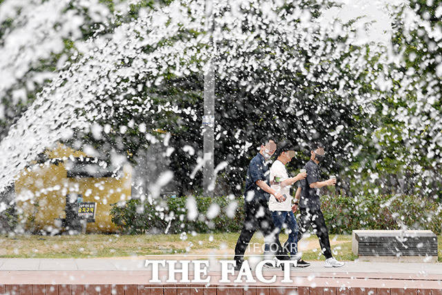[더팩트ㅣ남용희 기자] 무더위가 계속되는 22일 오후 서울 여의도 물빛광장을 찾은 시민들이 물줄기를 바라보며 더위를 식히고 있다.