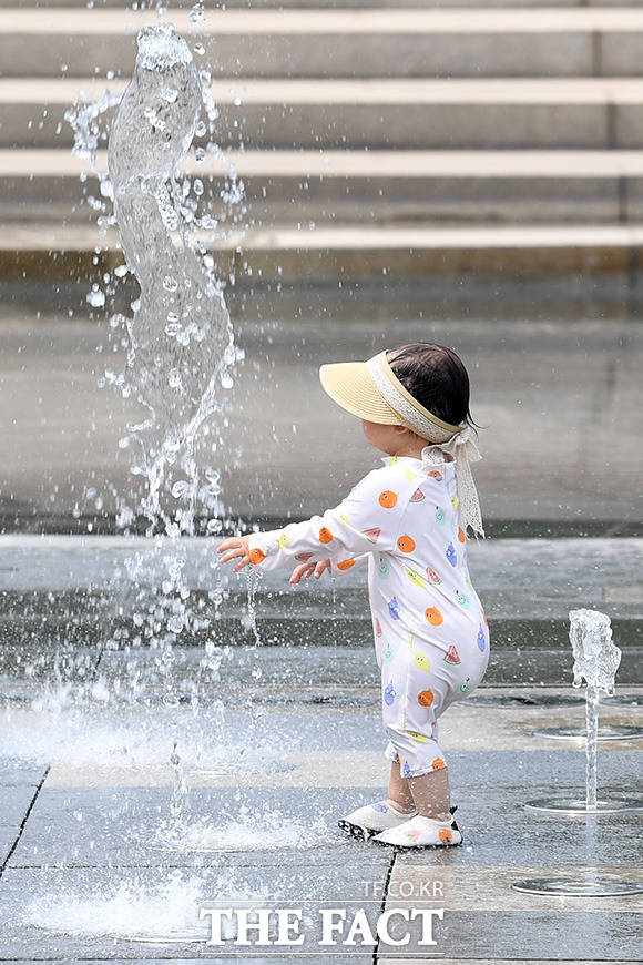 [더팩트ㅣ남용희 기자] 무더위가 계속되는 22일 오후 서울 여의도 물빛광장을 찾은 한 아이가 물놀이를 즐기며 더위를 식히고 있다.