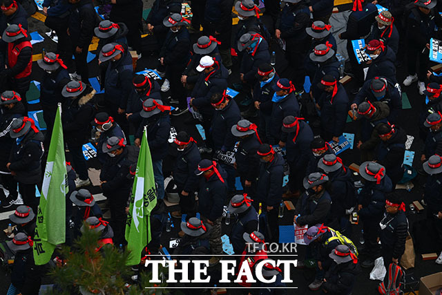[더팩트ㅣ남윤호 기자] 3일 오후 서울 여의도 국회 앞에서 열린 전국노동자대회에서 전국민주노동조합총연맹 소속 노동자들이 묵념하고 있다.