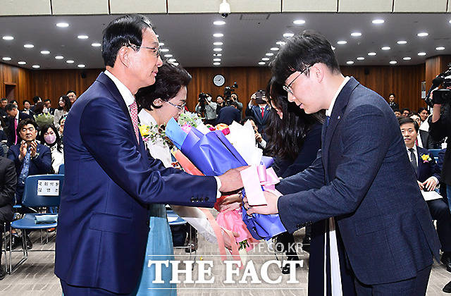 [더팩트ㅣ임영무 기자] 수협중앙회 이‧취임식이 24일 오후 서울 송파구 오금로 수협중앙회 본부에서 열린 가운데 제26대 수협중앙회장에 당선된 노동진 신임 회장(왼쪽)이 직원들로부터 꽃다발을 받고 있다.