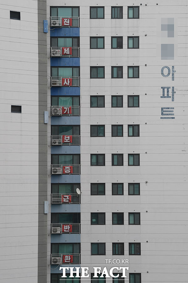 [더팩트ㅣ인천=남윤호 기자] 인천 미추홀구 전세사기 피해 주택에 대한 '경매 유예 조치'가 실시된 20일 오전 인천광역시 미추홀구 전세사기 피해 아파트에 '전세사기 보증금 반환하라'라고 적힌 현수막이 걸려있다.