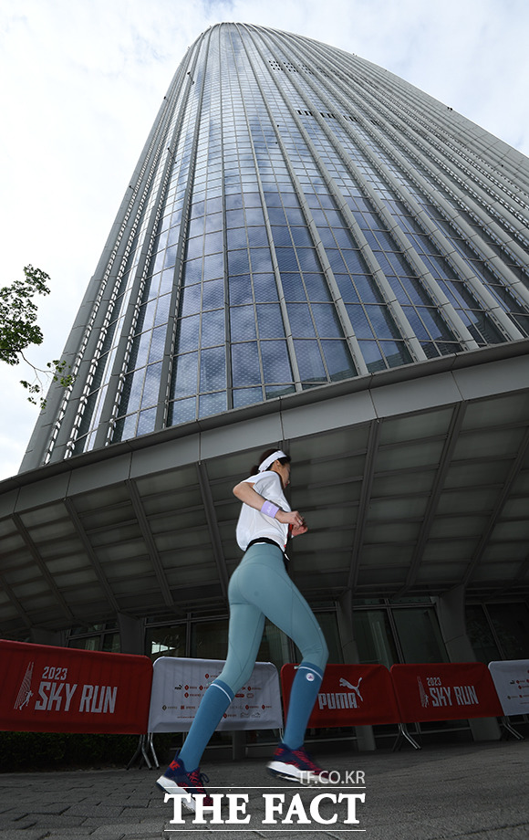 [더팩트ㅣ이동률 기자] 23일 오전 서울 송파구 롯데월드타워에서 열린 수직마라톤 대회 '2023 스카이런(SKY RUN)'에서 한 참가자가 정상을 향해 달리고 있다.