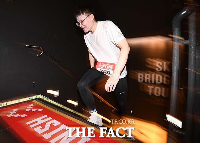 [더팩트ㅣ이동률 기자] 23일 오전 서울 송파구 롯데월드타워에서 열린 수직마라톤 대회 '2023 스카이런(SKY RUN)'에서 참가자들이 결승선을 향해 나아가고 있다.