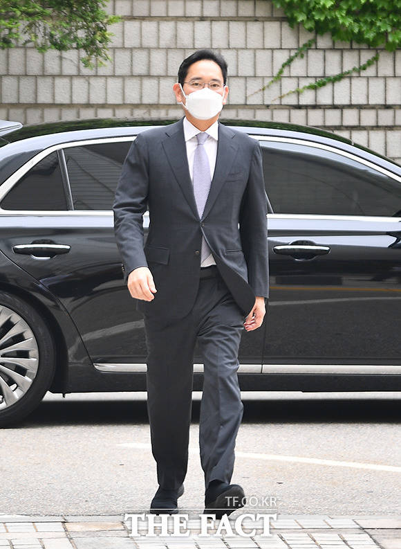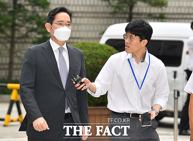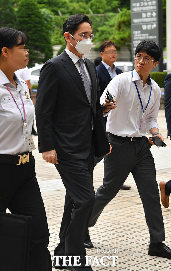 [더팩트ㅣ장윤석 인턴기자] '삼성 부당 합병' 혐의를 받는 이재용 삼성전자 회장이 7일 오전 서울중앙지방법원에서 열린 1심 공판에 출석하고 있다.