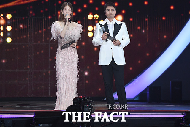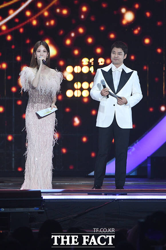 [더팩트 | 인천남동체육관=장윤석 인턴기자] 아티스트와 팬이 함께 만들고 즐기는 K-POP 축제 '2023 더팩트 뮤직 어워즈'가 10일 오후 인천 남동구 수산동 인천남동체육관에서 화려한 막을 올린 가운데 가수 서현(왼쪽)과 방송인 전현무가 진행을 하고 있다.