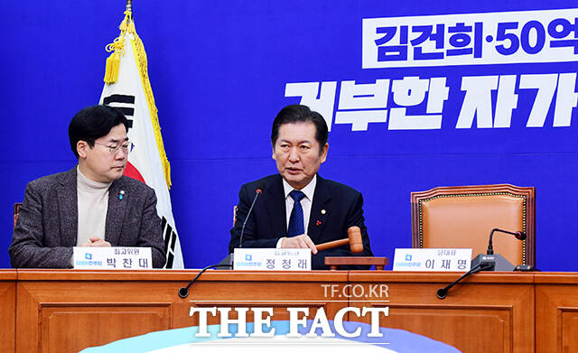 [더팩트ㅣ국회=배정한 기자] 정청래 더불어민주당 최고위원(오른쪽)이 12일 오전 서울 여의도 국회에서 열린 최고위원회의에 참석해 회으를 주재하고 있다.