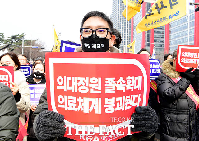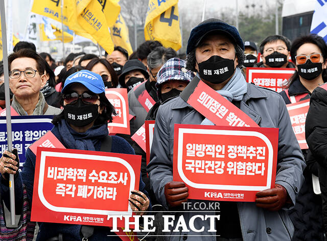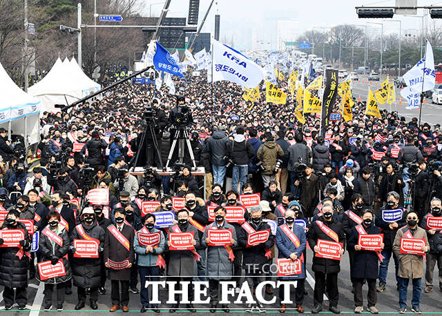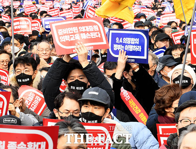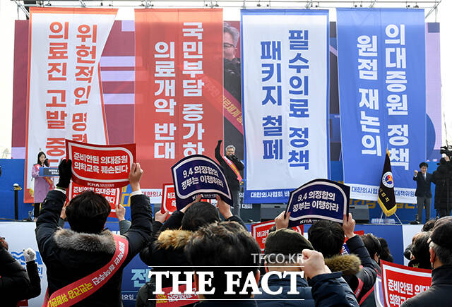 [더팩트ㅣ배정한 기자] '의대정원 증원 및 필수의료 패키지 저지를 위한 전국의사 총궐기대회'가 3일 오후 서울 여의도공원 옆 여의대로에서 열린 가운데 참가자들이 구호를 외치고 있다.