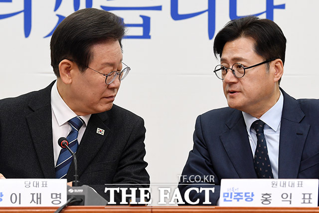[더팩트ㅣ국회=남용희 기자] 이재명 더불어민주당 대표(왼쪽)와 홍익표 원내대표가 15일 오전 서울 여의도 국회에서 열린 최고위원회의에서 대화를 나누고 있다.