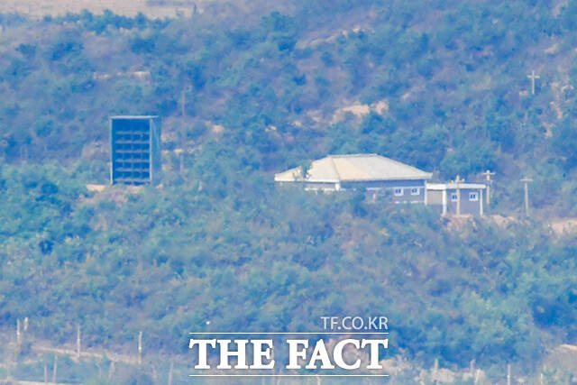 [더팩트ㅣ파주=장윤석 기자] 북한이 남한과 연결된 도로와 철길을 완전히 단절하고 요새화 공사를 진행할 것이라 밝힌 가운데 10일 오전 경기도 파주시 오두산 통일전망대에서 바라본 북한 개풍군 마을에 대남확성기로 추정되는 구조물이 설치돼 있다.