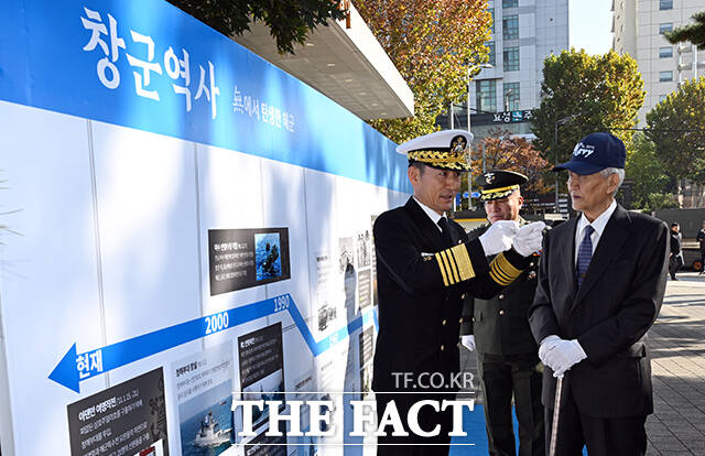 [더팩트ㅣ임영무 기자] 양용모 해군참모총장(가운데)과 박찬극 창군원로(해군사관학교 3기)가 11일 오전 서울 종로구 세운스퀘어 앞 옛 조달청 건물 터에서 79주년 해군 창설일을 기념해 열린 모병 벽보 부착행사에 참석해 창군 역사를 둘러보며 대화하고 있다.darkroom@tf.co.kr사진영상기획부 photo@tf.co.kr
