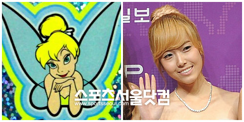 소녀시대 멤버 제시카는 전체적으로 금발로 염색한 헤어와 이마를 덮는 뱅 스타일 상투머리가 팅커벨 캐릭터와 닮았다. 앞머리를 전체적으로 길고 무거운 느낌으로 내리고 살짝 오른쪽으로 모아줬다.