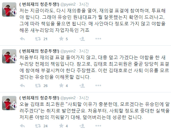 이어 "처음부터 재의결 표결 들어가지 않고 대충 덮고 가겠다는 야합을 한 새누리당 전체의 책임이다"면서 "참고로 김태호 최고위원은 줄곧 당당히 표결에 참여해 부결시켜야 한다 주장했다. 이런 김태호로선 사퇴 이유를 모르겠다는 유승민을 이해 못할 것"이라고 적었다.