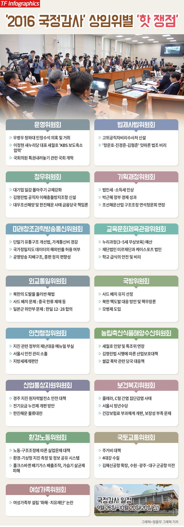 [더팩트 | 서민지 기자] 국회는 오는 26일부터 다음 달 15일까지 20일 간 20대 국회 첫 국정감사에 들어간다. 여야는 국감 기간 경주 지진·우병우 청와대 민정수석 의혹·북핵·사드 배치 등 산적한 현안을 두고 치열한 공방을 벌일 예정이다.