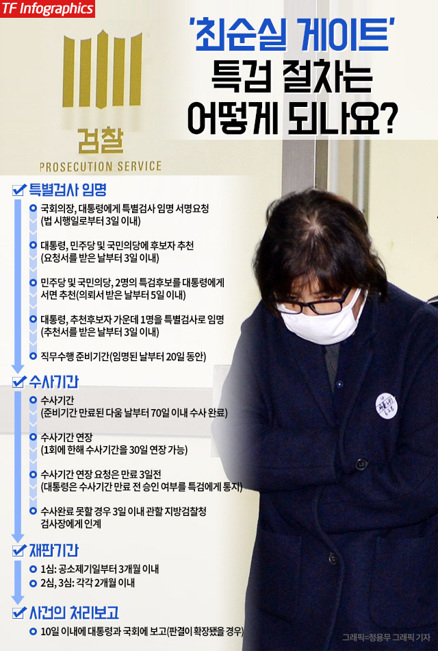 특검법이 순조롭게 진행된다면, 다음 달 6일까지 야당의 추천을 받아 박 대통령이 특별검사를 임명하게 된다. 또, 다음 달 26일부터는 압수 수색 등 강제 수사에 돌입할 수 있다. 수사 기간은 최대 120일로 내년 4월께 마무리될 전망이다.