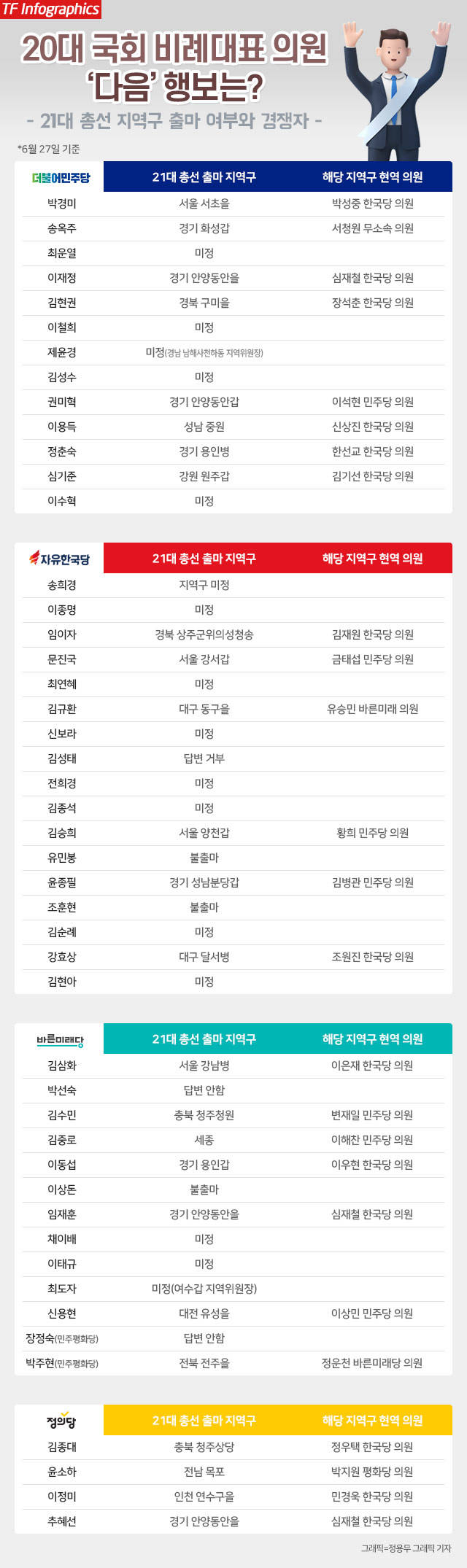 출마 여부가 미정인 경우는 크게 두 가지로 구분됐다. 나가고는 싶은데 지역구를 정하지 못한 경우와 나가고 싶지 않지만 당이 비례대표로 뽑아준 만큼 어려운 지역에 가서 희생하라는 요청이 있으면 다시 생각해 보겠다는 경우다.