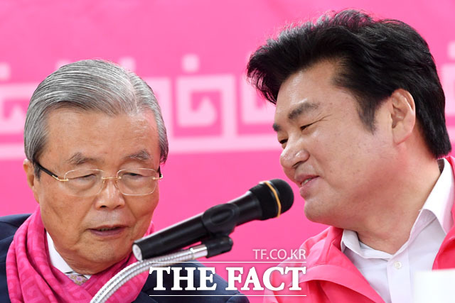 [더팩트 | 인천=남윤호 기자] 김종인 미래통합당 총괄선거대책위원장(왼쪽)과 원유철 미래한국당 총괄선거대책위원장이 3일 오전 인천광역시 남동구 인천광역시당사에서 열린 현장 선거대책위원회의에서 귀엣말을 나누고 있다.