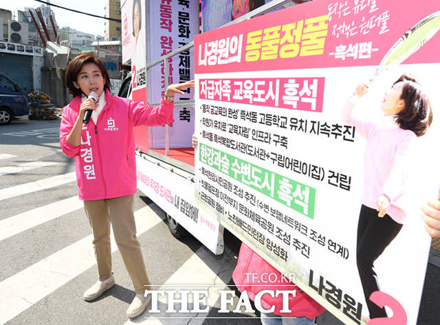 [더팩트ㅣ임세준 기자] 4.15총선 서울 동작구을에 출마한 나경원 미래통합당 후보가 3일 오후 서울 동작구 흑석동 빗물펌프장 앞에서 흑석동 관련 공약을 발표하고 지지를 호소하고 있다.