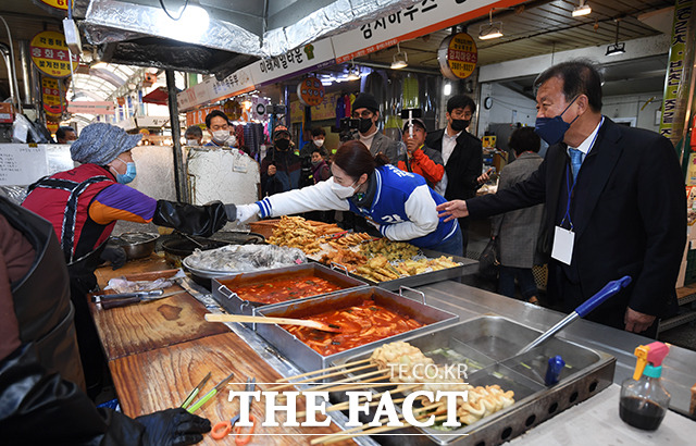 [더팩트ㅣ배정한 기자] 더불어민주당 국민지킴유세본부 '라떼는! 유세단' 원혜영 의원(오른쪽)이 3일 오후 서울 강서구 송화시장에서 유세중인 강선우 더불어민주당 강서갑 국회의원 후보(가운데)와 함께 지지를 호소하고 있다. hany@tf.co.kr 사진영상기획부 photo@tf.co.kr