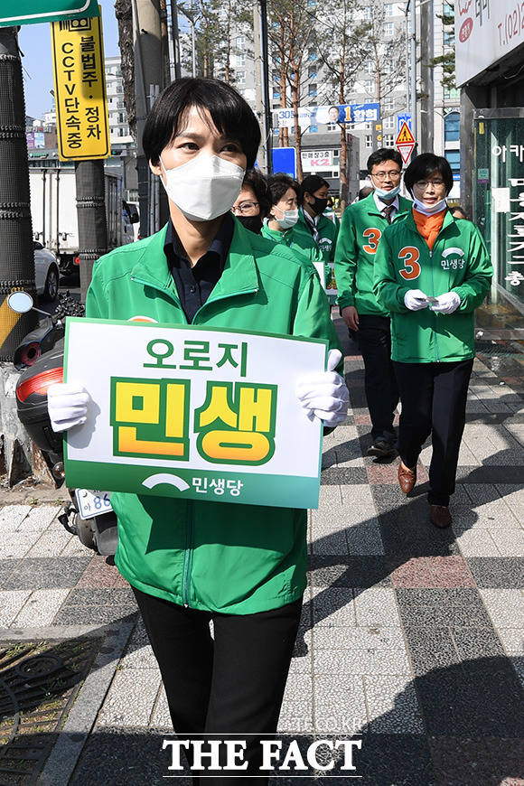 [더팩트ㅣ남용희 기자] 김정화 민생당 공동선대위원장(왼쪽)과 선거 운동원들이 3일 오후 서울 양천구 깨비시장을 방문해 상인들과 유권자들에게 지지를 호소하고 있다.