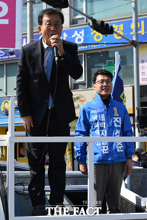 [더팩트ㅣ배정한 기자] 더불어민주당 국민지킴유세본부 '라떼는! 유세단' 단장을 맡은 원혜영 의원이 3일 오후 서울 강서구 방신전통시장에서 유세중인 진성준 더불어민주당 강서을 국회의원 후보와 함께 시민들에게 지지를 호소하고 있다. hany@tf.co.kr 사진영상기획부 photo@tf.co.kr