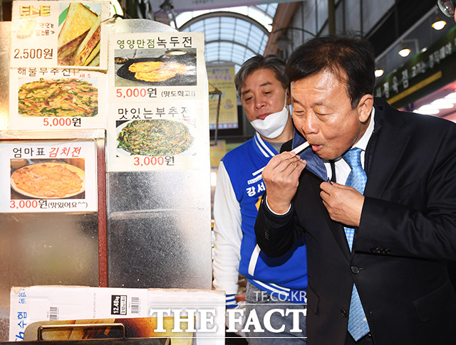 [더팩트ㅣ배정한 기자] 더불어민주당 국민지킴유세본부 '라떼는! 유세단' 단장을 맡은 원혜영 의원이 3일 오후 서울 강서구 방신전통시장에서 유세중인 진성준 더불어민주당 강서을 국회의원 후보와 함께 지지를 호소하던 중 한 상인이 건넨 전을 먹고 있다. hany@tf.co.kr 사진영상기획부 photo@tf.co.kr