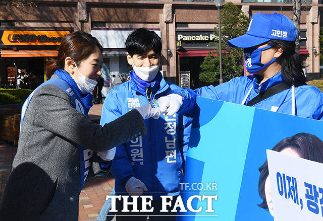 [더팩트ㅣ이동률 기자] 제21대 총선에서 서울 광진을에 출마한 고민정 더불어민주당 후보가 4일 오후 서울 광진구 뚝섬유원지역 인근에서 유세를 펼치며 유권자들의 지지를 호소하고 있다.