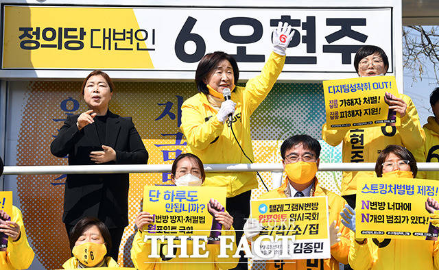 [더팩트ㅣ임영무 기자] 심상정 정의당 대표가 5일 오후 마포구 연남동 경의선 숲길에서 열린 '지금당장 N번방 해결촉구 집중유세'에 참석해 디지털 성착취를 규탄한뒤 서울 마포구을 오현주 후보의 지지를 호소하고 있다.